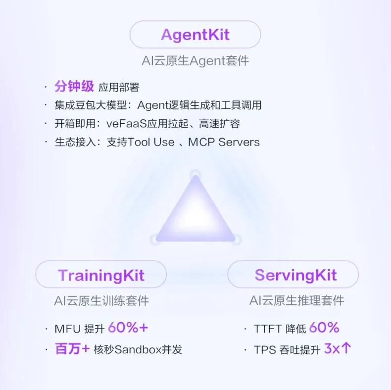 AgentKit、TrainingKit和ServingKit,助力企业做好智能体服务、模型训练和模型推理;多模态数据湖、Data Agent,助力企业构建智能化、高效化、低成本的智能体数据体系;AICC 密态计算、大模型应用防火墙,助力企业构筑网络安全防线,抵御针对智能体的恶意攻击……